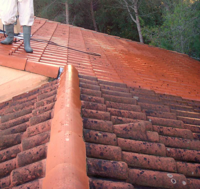 L'application d'un produit anti-mousse, préventif et curatif, est nécessaire pour retrouver un toit presque neuf.